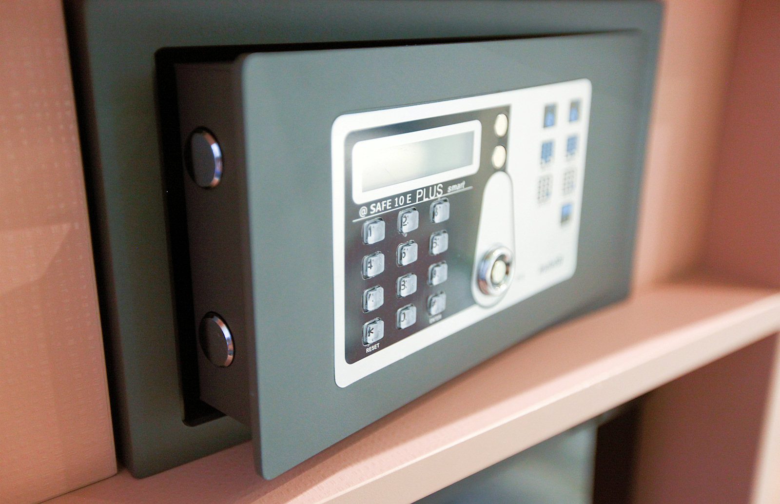 The room features a large and comfortable double bed. Amenities include air conditioning, a flat-screen TV with satellite channels, a wardrobe, USB-C ports for charging devices, a mini-fridge, a safe, and an electric kettle.